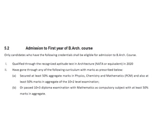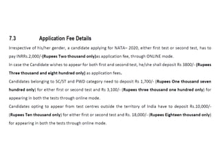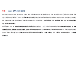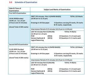 The document outlines the syllabus for the NATA examination 2020, highlighting key topics in mathematics, physics, chemistry, general aptitude, and drawing tests. Key areas in mathematics include algebra, matrices, trigonometry, calculus, permutations, combinations, and probability. It emphasizes skills in visualizing three-dimensional objects, architectural reasoning, and drawing techniques related to architecture.