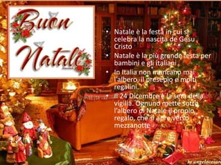 Il Natale in Italia celebra la nascita di Gesù Cristo ed è una festa molto attesa, soprattutto dai bambini. La vigilia include una cena a base di pesce e verdure, seguita dallo scambio di regali e dalla partecipazione alla messa di Natale, durante la quale si cantano tradizionali canti. I dolci tipici come panettone e pandoro completano le celebrazioni natalizie.