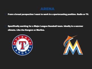 Nate Karsner is a student studying sportscasting at Full Sail University. He aims to work in sports broadcasting, ideally for a Major League Baseball team in a warm climate like Texas or Florida. Karsner has skills in social media, video editing, and sportscasting knowledge from his degree program. His goals are to build experience in the field through social media platforms and start a sports podcast to gain followers and show employers his abilities.