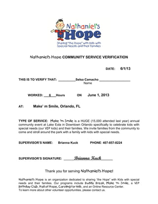 Selsa Camacho volunteered for 6 hours on June 1, 2013 at Make'em Smile Orlando, an annual community event celebrating children with special needs and their families. The event invites families to stroll through Lake Eola park with families who have children with special needs. Brianna Kuck, the supervisor, verified Selsa's community service hours.
