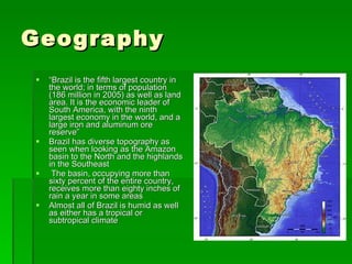 Brazil is the largest country in South America and the fifth largest country in the world. It has a population of over 186 million people and a diverse landscape that ranges from the Amazon basin to highlands. Brazilian culture is influenced by indigenous, African, and European cultures and traditions. The country experienced periods of colonial rule, empire, dictatorship, and has transitioned to a democratic government over the last few decades.