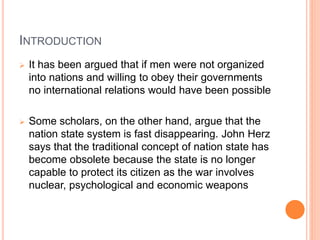 The document discusses the nation state system. It begins by arguing that nation states and their willingness to obey governments have enabled international relations. However, some scholars believe the nation state system is disappearing as states can no longer fully protect citizens due to modern weapons. The document then defines the nation state system according to Palmer and discusses how sovereign nation states interact to protect national interests. It traces the origin of the nation state system to the 1648 Treaty of Westphalia, which recognized state sovereignty. Key elements of the modern nation state are discussed as sovereignty, territorial integrity, and legal equality. However, the nation state system faces setbacks from factors like growing interdependence, regional integration, nuclear weapons, and the roles of public opinion and mult