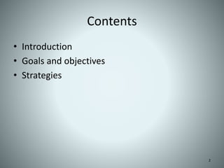 The National AIDS Control Programme was launched in 1987 in India to halt and reverse the HIV/AIDS epidemic over 5 years. It aims to reduce new infections by 60% in high prevalence states through targeted interventions for high-risk groups and general population education. Objectives include preventing new infections, improving treatment and care for those infected, strengthening infrastructure and resources, and building strategic information systems. Key strategies are saturation coverage of high-risk groups, scaling up general population interventions, improving care and support, and strengthening nationwide monitoring.