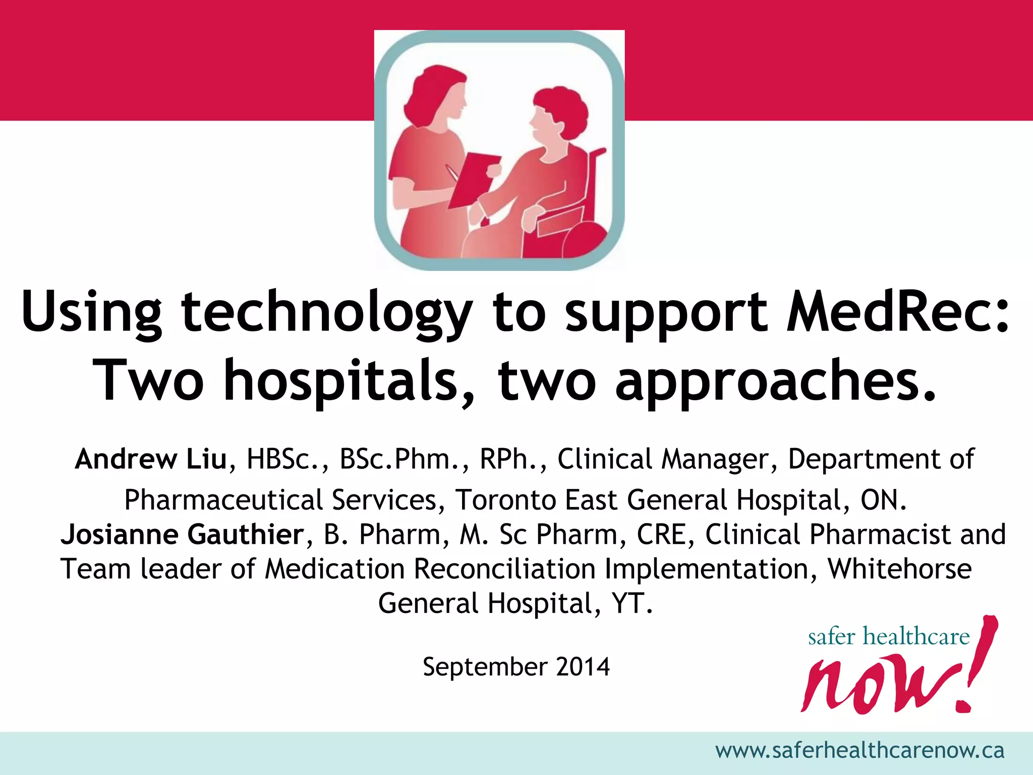 This document summarizes two presentations from a webinar on approaches to medication reconciliation using technology. The first presentation describes Toronto East General Hospital's implementation of electronic medication reconciliation using their Cerner EHR system. The second presentation describes Whitehorse General Hospital's use of Iatric Software's Patient Discharge Instructions system to conduct medication reconciliation at admission and discharge when an EHR is not available. Both implementations have improved medication reconciliation processes but also face challenges around physician engagement, customization of reports, and integration with other systems.