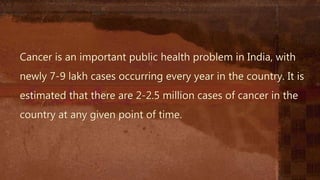 The national cancer control programme was launched in India in 1975-76 to address the growing problem of cancer cases occurring in the country. It aims to prevent cancer, promote early diagnosis and treatment. The programme was revised in 1984-85 and 2004 to strengthen facilities and address gaps across India. Key objectives include primary prevention through education, secondary prevention of common cancers via screening, and tertiary prevention by strengthening therapy and palliative care. Various schemes provide assistance to cancer centers, hospitals, NGOs and districts for equipment, education, screening and research to better control cancer in India.