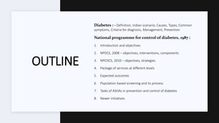 The document outlines the Indian diabetes scenario, including its definition, prevalence, types, symptoms, diagnosis criteria, management, and prevention strategies. It highlights significant government initiatives like the National Programme for Prevention and Control of Diabetes, addressing the rising burden of non-communicable diseases and aiming for early detection and effective management strategies. The need for lifestyle changes, community awareness, and an integrated approach to healthcare services is emphasized to reduce diabetes's impact on society.