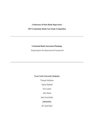 Centennial Bank, a community bank in Texas with $720 million in assets, is focusing on strengthening its succession planning which includes employee development and talent retention. While they have made progress in formalizing their succession plan, including new leadership assessments, they still lack comprehensive written strategies and have not taken action to replace board members. The bank aims to grow its assets to $1 billion in five years but acknowledges that recent growth has posed challenges due to management turnover and the need for formal succession protocols.