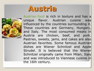The document provides summaries of the traditional cuisines of several European countries. It notes that Austrian cuisine was influenced by surrounding Germany, Hungary, and Italy and is known for dishes like Wiener Schnitzel and strudel. Traditional Norwegian cuisine revolves around smoked salmon and fish. English food incorporated spices from India and features pastries, pies and pudding. Spanish food blends influences from Romans, Greeks and Celts and uses ingredients like beans, potatoes and peppers.