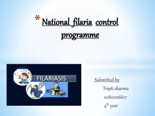 The document discusses lymphatic filariasis (LF), a parasitic disease spread by mosquitoes. It outlines the National Filariasis Control Programme in India, including control strategies like mass drug administration, vector control, and morbidity management. The key goals are to eliminate LF as a public health problem in India by 2021 through annual treatment of at-risk populations and managing symptoms for infected individuals. Significant progress has been made, with over 94 districts qualifying for stopping mass drug administration after validation surveys.