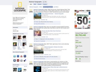 National Geographic uses social media to share the organization's mission of inspiring people to care about the planet. They have over 1.5 million Facebook fans and 250,000 Twitter followers. National Geographic also encourages user-generated content through programs like MyShot, where members have submitted over 600,000 photos. The organization aims to build a digital ecosystem to engage wider audiences around the world in science, exploration, and conservation.