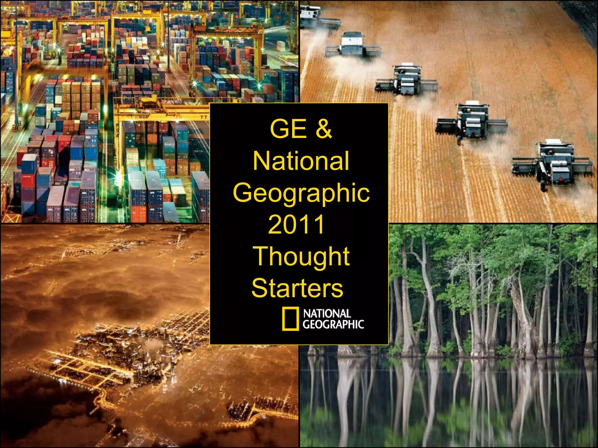 The document discusses National Geographic and GE's commitment to sustainability through a year-long exploration of world population issues in National Geographic's magazine and online platforms. It outlines opportunities for brands to partner with the "7 Billion" initiative through advertising, sponsorships, and forums to engage with key audiences on solutions for population challenges.