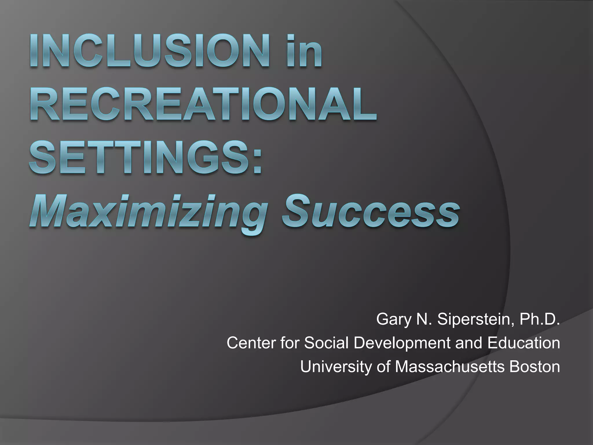 This document discusses inclusion in recreational settings such as camps. It defines inclusion as social, functional, and physical inclusion where people with disabilities are socially accepted, have necessary supports to participate, and are present respectively. Recreational settings promote equal participation and social interaction compared to classrooms. Friendships are more likely to form at camps than schools. Successful inclusion requires understanding campers, families, camp readiness, and creating opportunities for social interaction through activities and supports. Inclusion benefits all participants by fostering understanding and respect.