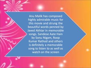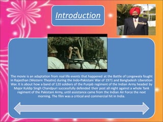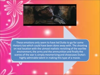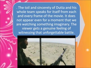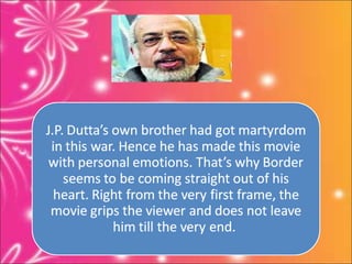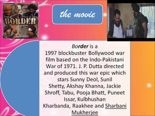 The document summarizes a movie called "Border" that has powerful action scenes, technical aspects, and cinematography. It discusses the movie's message of national integration in India as well as its heart-touching music. The summary concludes by recommending viewers watch the movie if they love their mother, India.