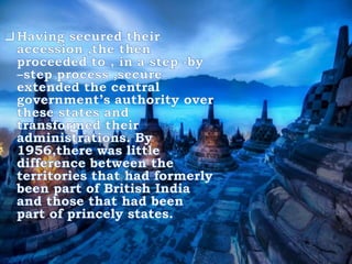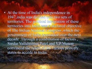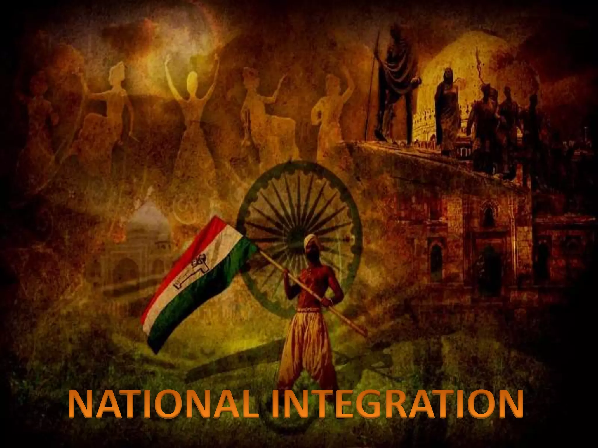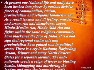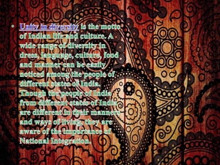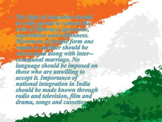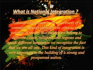 The document discusses national integration in India. It outlines the history of national integration movements in India such as the Swadeshi movement and non-cooperation movement. It also discusses the concept of unity in diversity in India and challenges to national integration such as regional aspirations, communalism, and religious fanaticism. Additionally, it outlines some of the forces that promote national integration in India such as the constitution, democracy, secularism, national festivals, and national symbols.