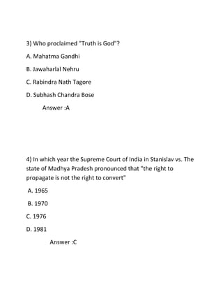 This document contains 11 multiple choice questions with answers about topics related to national integration in India. The questions cover concepts like the definition of state, the number of districts affected by Naxalism, who proclaimed "Truth is God", the year certain rights were established, instruments that contribute to national integration, when the National Integration Council was constituted, problems it addresses, number of recognized languages in the Constitution, the date of National Integration Day observation, classical languages, and the definition of communalism in India.