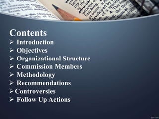 The National Knowledge Commission was established in 2005 as an advisory body to the Prime Minister of India to guide reforms in key areas like education, science, technology, agriculture, and e-governance. It was chaired by Sam Pitroda and had a three year mandate. The Commission made recommendations to strengthen education, promote research and innovation, leverage technology, and improve knowledge sharing. Some proposals faced controversies. Several recommendations saw follow up action by the government, including establishing new universities and networks, enhancing vocational education, and expanding e-governance initiatives.