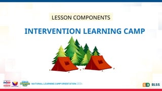 The document outlines the structure and components of an intervention learning camp designed for grades 7 and 8, focusing on enhancing both numeracy and literacy skills. It describes interactive lessons that include activities such as speed challenges, worksheets, and a bingo game to consolidate learning. The camp provides a second chance for students to acquire fundamental skills through engaging and supportive teaching methods.