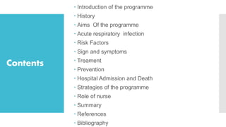 The National Acute Respiratory Infections Control Programme, initiated in 1990, aims to reduce child mortality due to pneumonia through improved treatment practices and early detection. It focuses on training healthcare providers to manage acute respiratory infections effectively, promoting maternal education, and ensuring timely referrals for severe cases. The programme incorporates strategies such as standard care management, vaccination, and community involvement to combat ARIs in children under five.