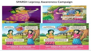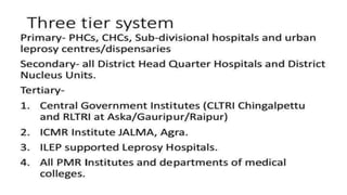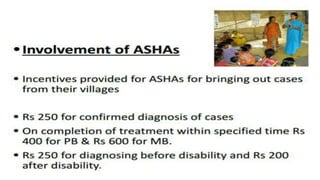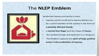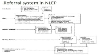 The document presents information on the National Leprosy Eradication Programme (NLEP) in India. It discusses the classification and diagnosis of leprosy, the objectives and strategies of NLEP, and the roles of ASHA workers and community health nurses in supporting treatment, disability prevention, and raising awareness of leprosy in communities. Key milestones of NLEP include the introduction of multidrug therapy in 1983 and integration with general health services. NLEP aims to eliminate leprosy at the national level through early detection, treatment, and health education.