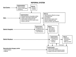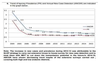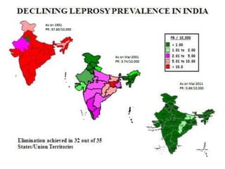 The document summarizes India's National Leprosy Eradication Programme. It discusses that leprosy is caused by Mycobacterium leprae bacteria and mainly affects the skin and peripheral nerves. The key milestones of the programme included introducing multi-drug therapy in 1982 and achieving elimination at the national level in 2005. The current strategies include integrating leprosy services into general healthcare, promoting early detection and complete treatment, involving ASHA workers, and reducing stigma through information campaigns. The goal is to continue driving down prevalence rates toward total eradication of the disease in India.