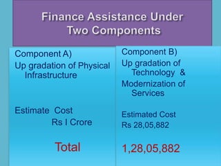 The document outlines a proposal to upgrade the physical infrastructure and modernize services at the State Central Library in Kerala, which is over 100 years old. The proposal has two main components: upgrading the physical infrastructure for Rs. 1 crore, and upgrading technology and services for Rs. 28,05,882. The technology upgrades include digitizing materials, installing CCTV in the main and children's libraries, and setting up a WiFi enabled reading room. The goal is to improve library services and infrastructure to better serve patrons and potentially serve as a model for other libraries in Kerala.