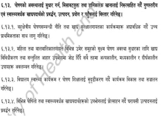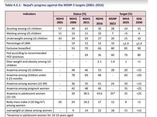 The National Nutrition Programme in Nepal aims to improve the nutritional status of its citizens, particularly focusing on vulnerable populations including children, pregnant women, and adolescents. It encompasses a variety of nutrition-related initiatives and programs to address malnutrition and promote health, aligning with global and national strategic frameworks. The program emphasizes collaborative efforts across sectors to address both under-nutrition and over-nutrition, while also targeting specific health outcomes aligned with sustainable development goals.