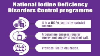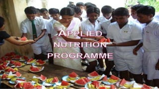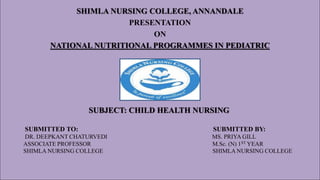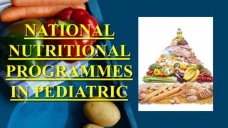 The document outlines the various National Nutritional Programmes in India, focusing on child health and nursing. It details the objectives, policies, and specific programmes initiated by different ministries aimed at improving the nutritional status of children and addressing malnutrition. Key initiatives include the Integrated Child Development Services (ICDS), Mid-Day Meal Programme, and Nutrition Programmes for pregnant, lactating women, and adolescent girls, which aim to enhance health outcomes and reduce malnutrition in vulnerable populations.