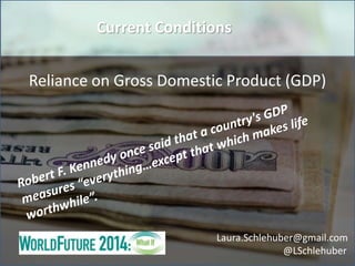 The document discusses the limitations of Gross Domestic Product (GDP) as a measure of national performance by 2030, highlighting issues such as declining pension coverage, increasing inequality, and environmental degradation. It argues for the retirement of GDP in favor of alternative metrics that better reflect economic, environmental, and social factors. The document also includes a discussion on calculating a Genuine Progress Indicator (GPI) as a more comprehensive measure of well-being.