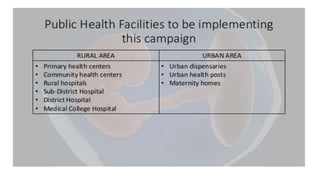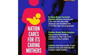 3) Pradhan Mantri Surakshit Matritya Abhiyan (PMSMA) which focuses on improving maternal and child health through various initiatives.