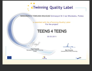 National Quality Label 1. MAłGORZATA TOMCZAK-WALKUSZ Gimnazjum Nr 3 we Włocławku, Polska