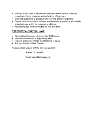 Vemag New Zealand Pty Ltd is seeking a Service Manager to run their technical department due to expansion. This hands-on role is based in Auckland and requires traveling nationwide to customers for installations, maintenance, and repairs. Key responsibilities include managing service technicians, meeting service targets, providing excellent customer service, and expanding the company's presence. The ideal candidate has electrical qualifications, mechanical skills, food manufacturing experience, and the right to work in New Zealand.