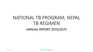 The document details the tuberculosis (TB) treatment regimens used in Nepal for the fiscal year 2074/2075, emphasizing both new and retreatment cases, including the phases of treatment and specific tests for drug resistance. It outlines the categorization of drugs, including the phasing out of certain regimens and the introduction of shorter and longer MDR-TB treatment regimens. Additionally, it highlights the use of novel drugs like bedaquiline for complex TB cases.