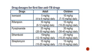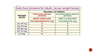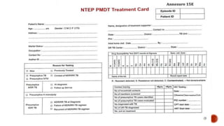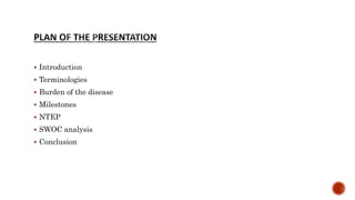 The document provides an overview of tuberculosis (TB) in India, including key terminology, disease burden statistics, milestones in the country's TB program, and details of the current National Tuberculosis Elimination Program (NTEP). It notes that India accounts for over a quarter of global TB cases. The NTEP aims to eliminate TB in India by 2025 through strategies like improving diagnosis, ensuring appropriate treatment, preventing at-risk populations from developing TB, and strengthening related policies and resources. It outlines diagnostic protocols, treatment regimens, and initiatives to engage private providers and provide social support to patients.