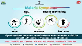 The National Vector Borne Disease Control Program (NVBDCP) focuses on the prevention and control of diseases like malaria, dengue, chikungunya, and others through various strategies, including elimination frameworks and vector management. The document outlines specific goals for malaria elimination by 2030, along with the categorization of states based on their malaria transmission levels and corresponding interventions to control these diseases. It emphasizes the importance of surveillance, early diagnosis, and community involvement in managing vector-borne diseases.