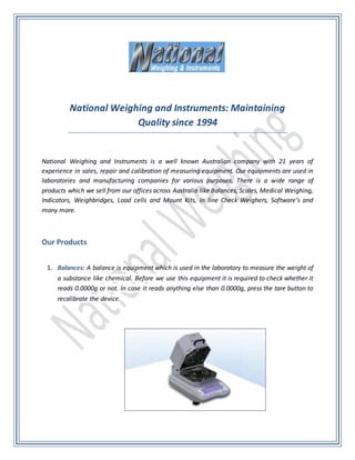 National Weighing and Instruments is an Australian company with over 21 years of experience selling, repairing, and calibrating various types of measuring equipment. They offer a wide range of products across Australia, including balances, scales, medical weighing equipment, indicators, weighbridges, load cells, check weighers, and software. The document provides details on the different product types and applications.