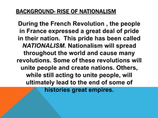Nationalism arose during the French Revolution and spread throughout Europe, causing both revolutions that united nations and the collapse of empires. Nationalism led to the unification of Italy and Germany by inspiring independence movements. It divided India along religious lines and prompted Zionism among Jews. The Ottoman Empire declined as ethnic groups wanted independence, leading to its collapse.
