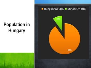 This document summarizes nationalities and minority rights in Hungary. It notes that Hungarians make up 90% of the population, with 13 recognized minority groups making up the other 10%. These minorities have rights like self-government and the use of their own languages in education. It then provides more detailed overviews of the Romanian, Polish, and Greek minorities in Hungary, including their population sizes, organizations, cultural events, and important figures. It concludes by stating that while Lithuanian, Spanish, and Turkish nationalities are not represented, visitors are welcome to learn more about Hungary's culture.