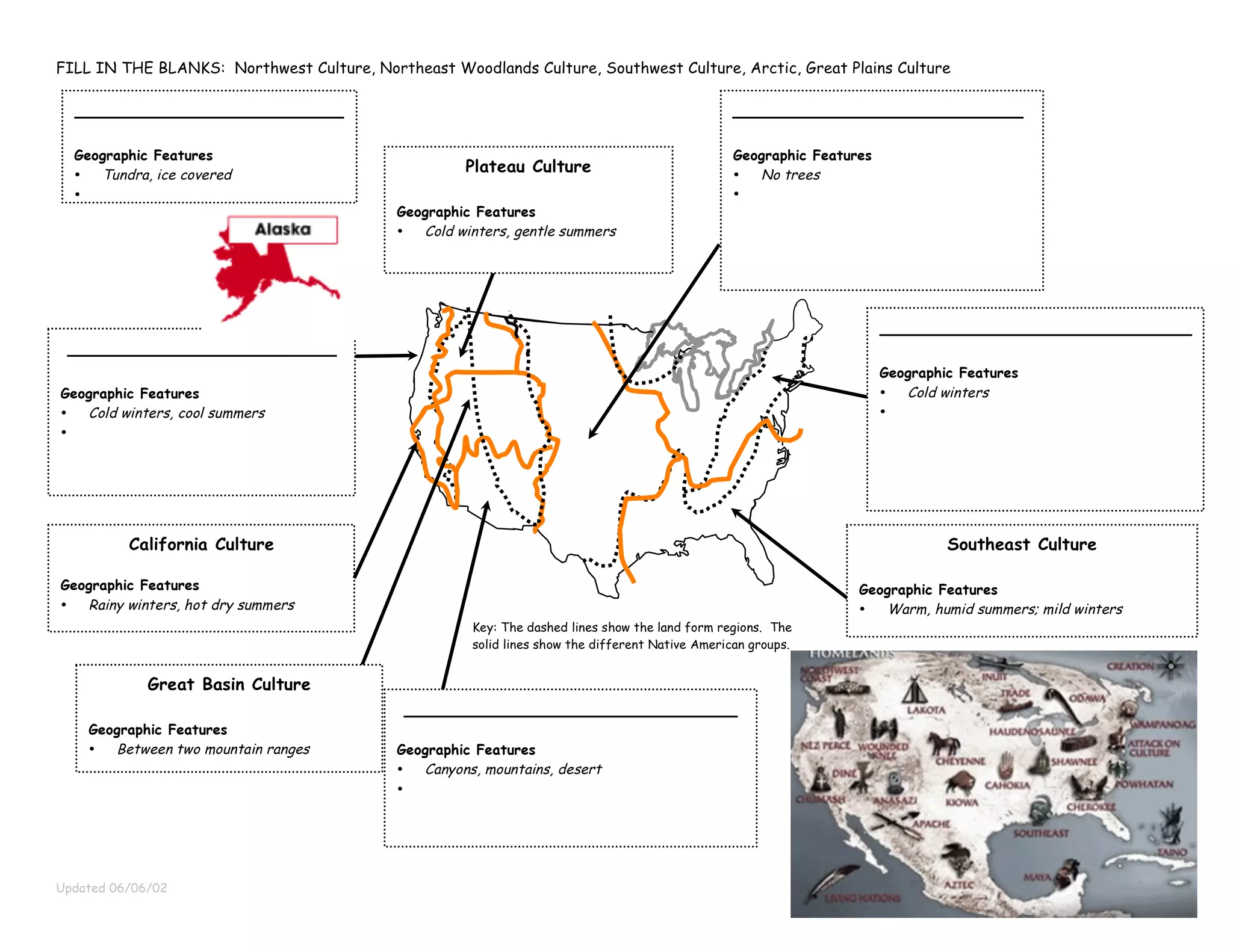 The document fills in the blanks of different Native American cultures by geographic region. The Arctic culture lived in tundra and taiga forests, hunting and fishing with ice block or sod houses. The Great Plains culture inhabited grasslands with no trees, hunting buffalo and living in teepees. The Northwest culture experienced cold, rainy winters and cool summers in coastal forests, gathering and hunting fish, whale, deer, and berries and living in large wooden houses.
