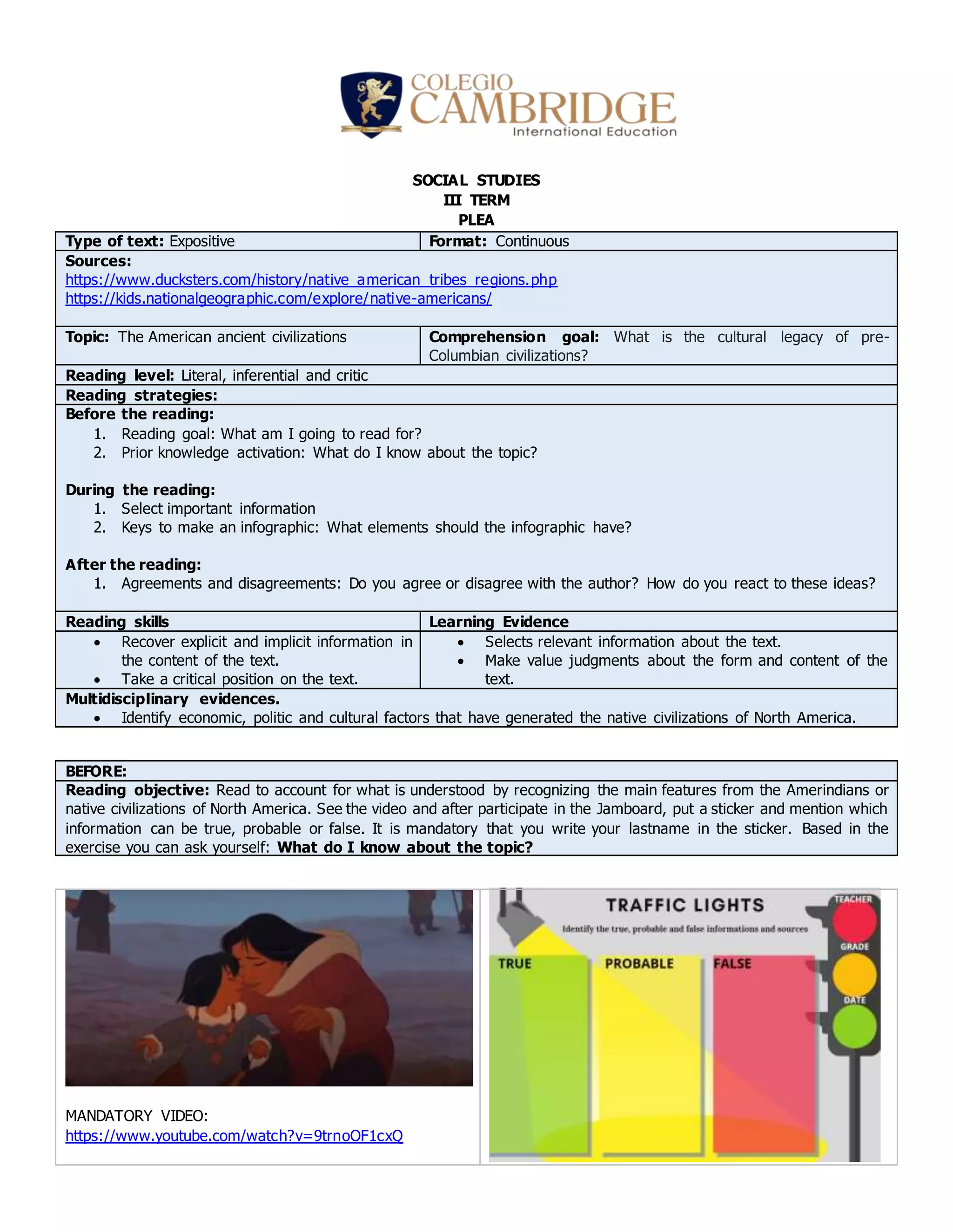 The document provides instructions for a social studies assignment on the ancient civilizations of pre-Columbian North America. Students are asked to read sources on various Native American tribes and regions, then work collaboratively to create an infographic about one topic. They must include key information like images, short descriptive texts, and citations of sources. After reading, students will discuss in a chat whether they agree with common misconceptions about Native Americans presented in a second video.
