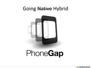 This document discusses building native mobile apps using Oracle Application Express (APEX) and web technologies. It describes using PhoneGap to wrap an APEX web app into a native mobile application, allowing it to access device APIs. The document outlines getting started with PhoneGap, integrating it with APEX, domain whitelisting requirements, and the PhoneGap API. It compares building native apps versus mobile web apps, and argues PhoneGap allows developing once for multiple platforms using HTML5, CSS, and JavaScript.