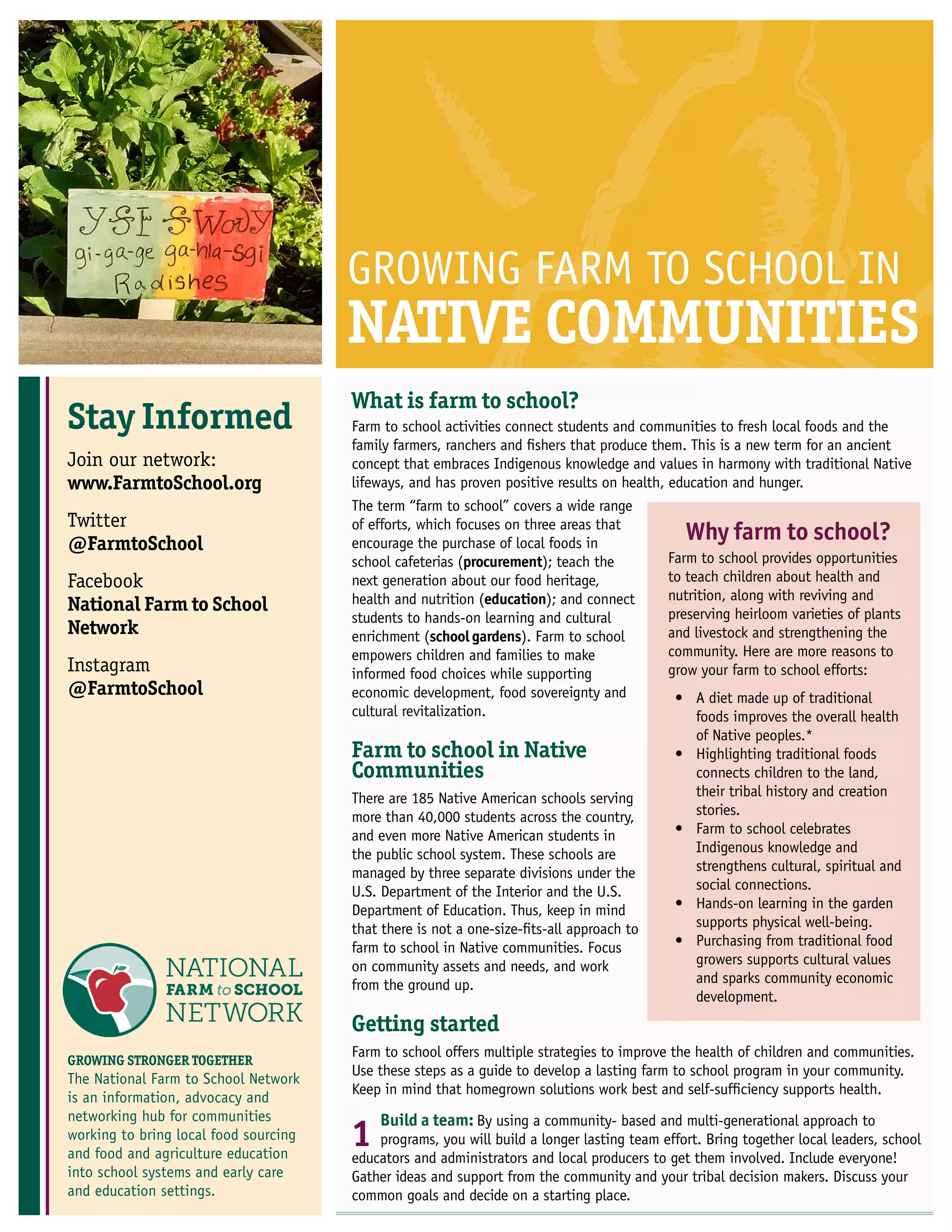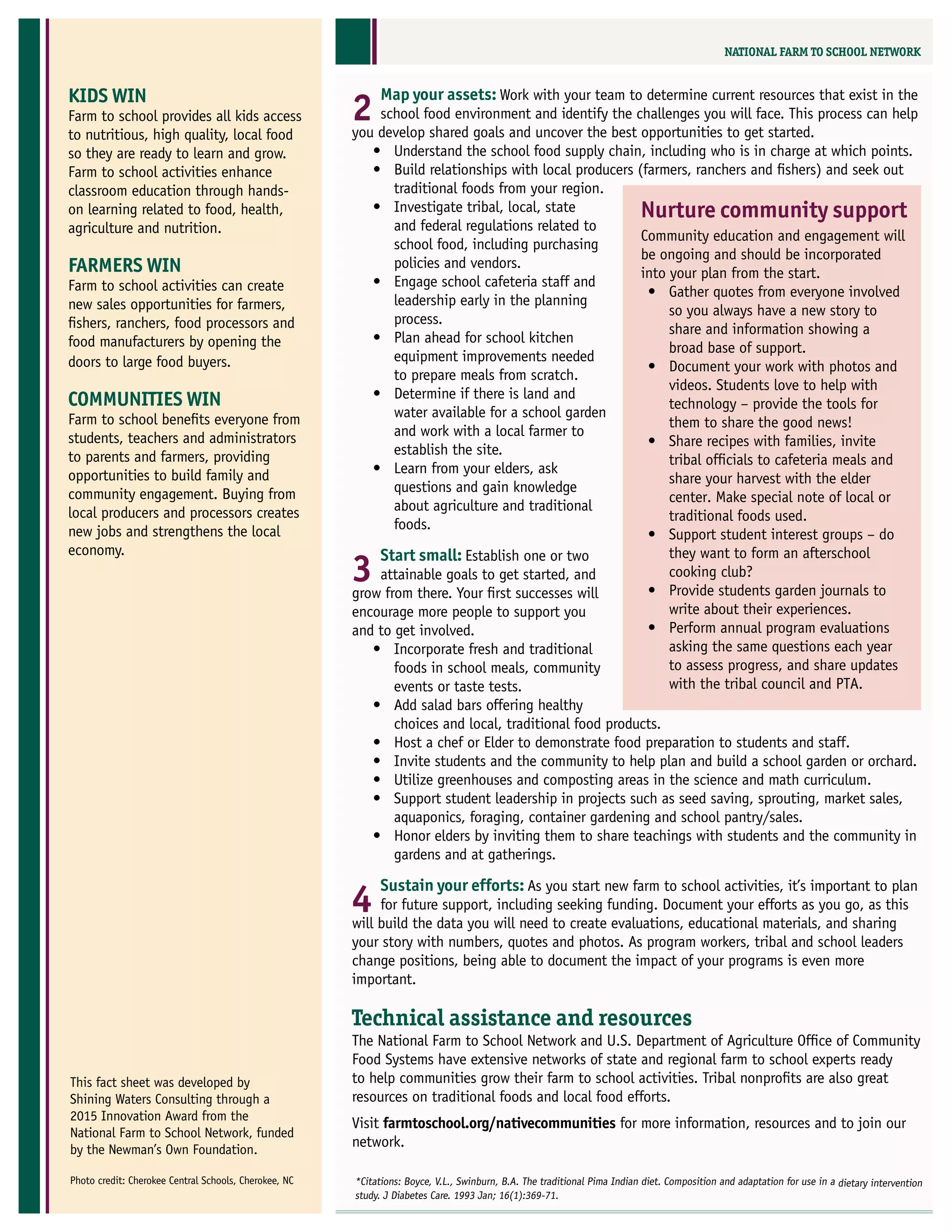 This document provides guidance on developing farm to school programs in Native communities. It discusses how farm to school connects students to local foods, traditional foods, and family farmers while promoting health, education, and food sovereignty. The document recommends taking a community-based approach, starting small by incorporating local and traditional foods into school meals and events, and sustaining efforts by seeking funding and documenting impacts. The overall goal is to empower children and families through culturally relevant farm to school activities.