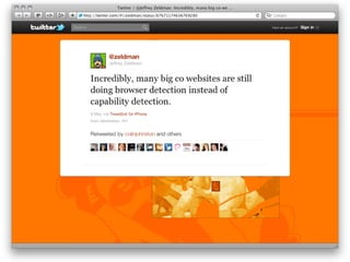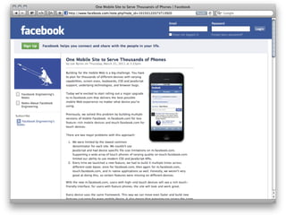The document discusses the challenges and complexities faced by mobile web developers, highlighting that only 21% of Google's largest advertisers have mobile websites. It suggests that native applications are generally easier to design, build, and sell compared to mobile web solutions, which often face issues of fragmentation and inconsistent standards. The article advocates for a shift toward promoting standards-based mobile websites under the buzzword 'HTML5 apps' to help improve interest and investment in mobile solutions.