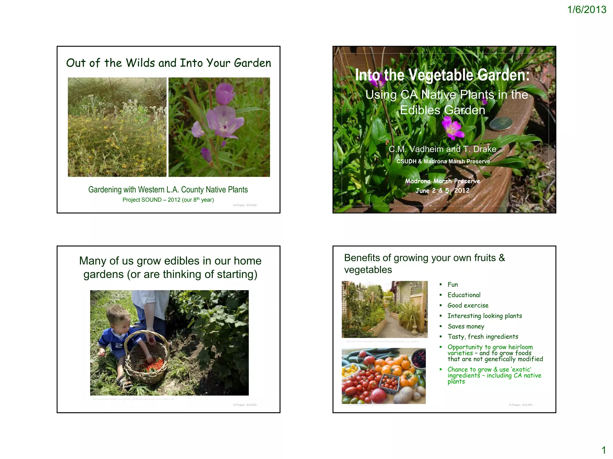 This document discusses using California native plants in edible gardens. It provides information on the benefits of growing your own fruits and vegetables and compatibility of native plants and edible gardens. Several native plants are highlighted, including miner's lettuce, fringed redmaids, and bull clover, with details on their growth, uses, and edibility. The document also includes plans for incorporating these and other native plants into a cool-season vegetable garden.