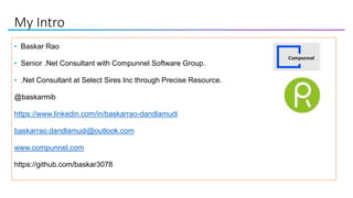 This document provides an overview of NativeScript, an open source framework for building native mobile apps using JavaScript. It discusses NativeScript's prerequisites, app structure, basic commands, controls, and includes a demo. NativeScript allows building cross-platform apps with a single codebase using HTML, CSS, JavaScript, Angular, TypeScript or Vue. Development tools mentioned include Visual Studio Code, NativeScript Playground, and Sidekick.