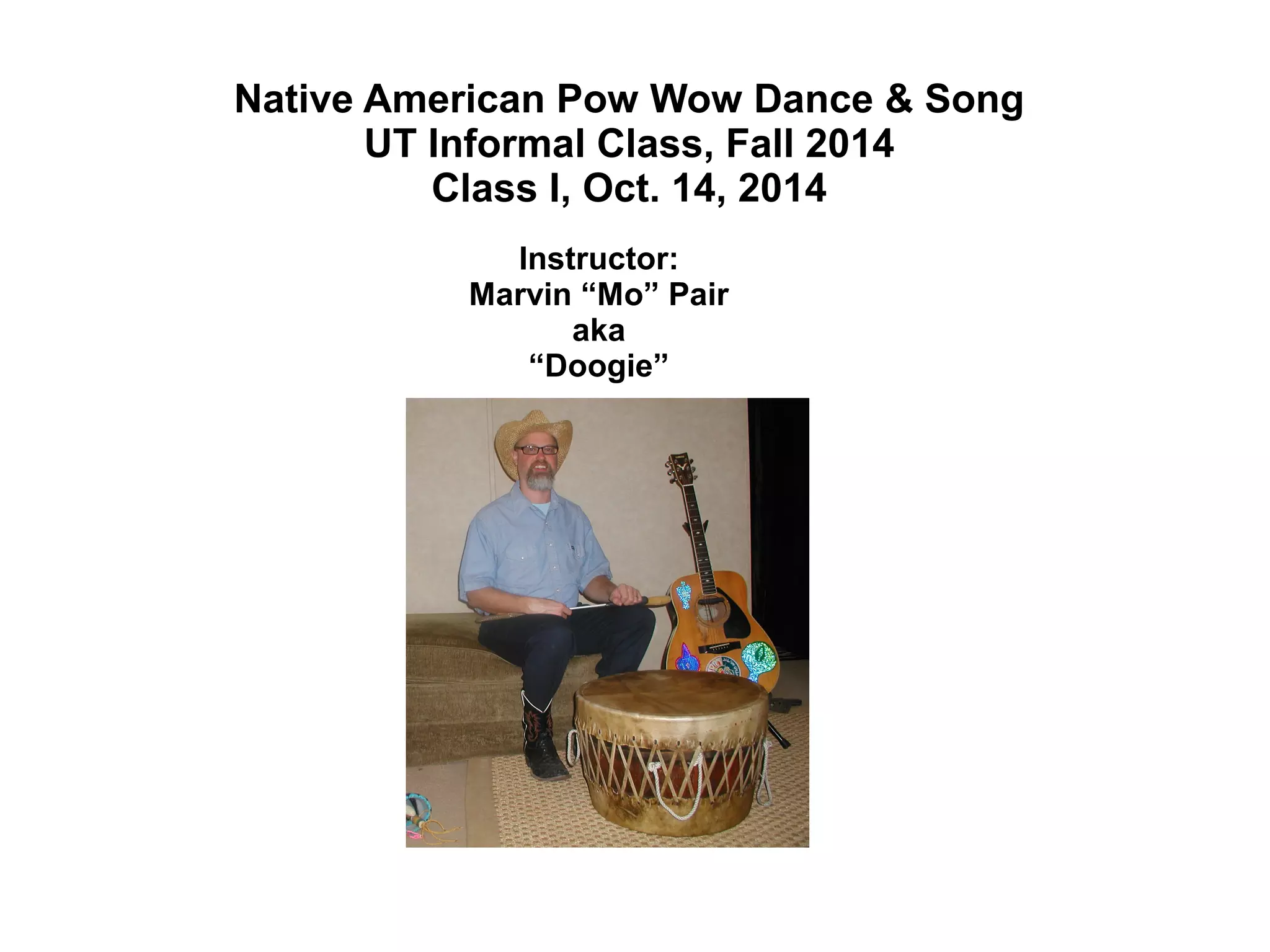 This document provides an overview of an upcoming class on Native American Pow Wow dance and song. The class will cover the history and origins of Pow Wows, styles of Pow Wow dance and clothing, tribal-specific dances, and Pow Wow songs. It discusses conflicting accounts of the origins of Pow Wows and how they developed from medicine shows and wild west exhibitions during a time of cultural oppression for Native Americans. The class materials draw from scholarly sources on indigenous knowledge and Pow Wow traditions.