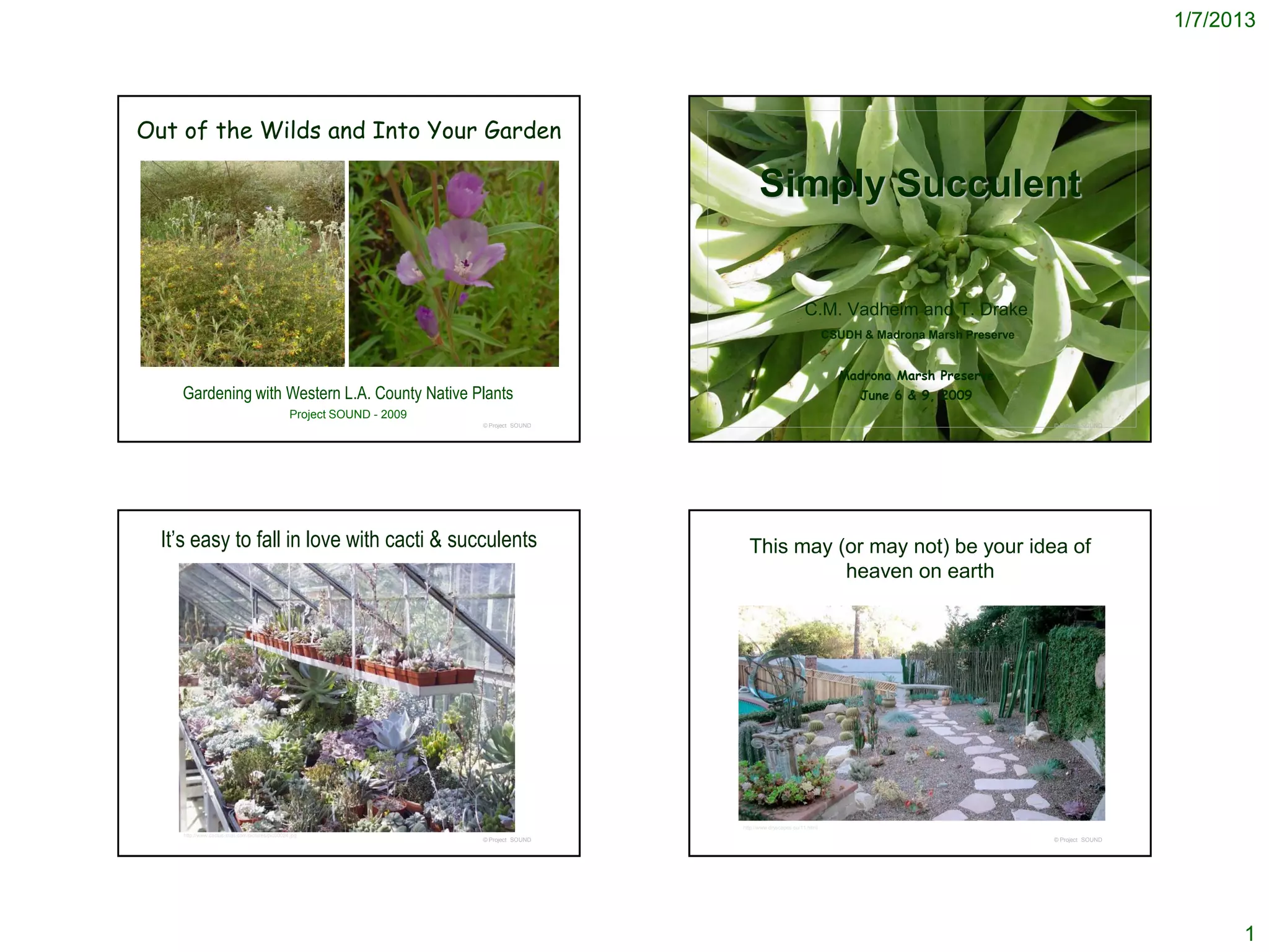 This document provides information about growing succulent and cactus plants native to coastal Southern California. It discusses different types of succulents, characteristics of common coastal cacti like prickly pear and cholla, and recommends succulents and cacti as low-water plants suitable for drought-tolerant gardens near the coast. The document also provides photos and descriptions of several native succulent and cactus species well-adapted to the climate, including their growth requirements and uses in habitat restoration or landscape gardens.