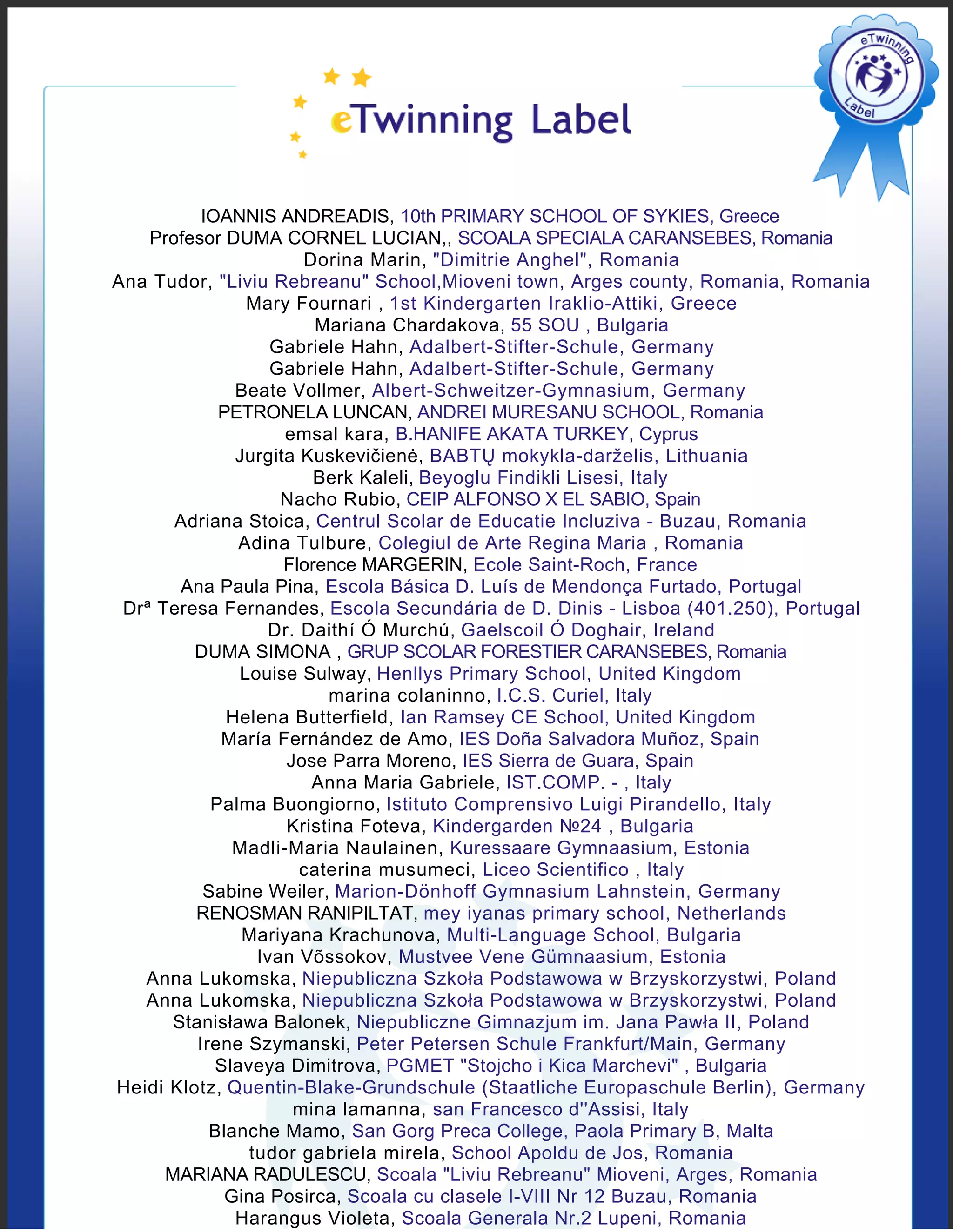 This document announces that several schools and educators from across Europe have been awarded a label for their joint project titled "Every year students from all over Europe celebrate The Birth of Son of God or Christmas". The document lists representatives from schools in Greece, Romania, Bulgaria, Germany, Italy, Spain, Portugal, Ireland, Netherlands, United Kingdom, Estonia, Lithuania, Poland, Czech Republic, Slovakia, Malta, Cyprus, and Turkey who were involved in the project and received the award. It provides the date of the award as December 3, 2008.