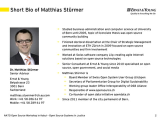 The document discusses the open source project OpenJustitia, initiated by the Federal Supreme Court of Switzerland to manage court documents and decisions through an internal system. It outlines the rationale for choosing an open source approach, including cost efficiency and improved software stability, as well as the project's modular structure and community governance. The document also highlights the community's principles, intended members, and future developments in the OpenJustitia project.