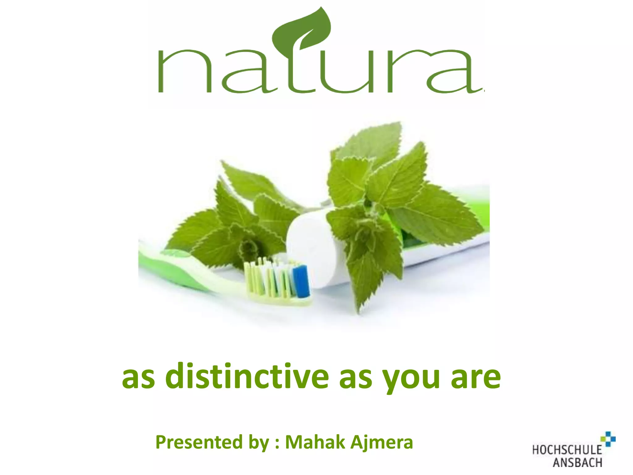 The document discusses Natura herbal toothpaste. It notes that many consumers are switching to natural toothpastes to avoid artificial flavors. Natura contains herbal extracts like Sarcandra Glabra and Fennel that are antibacterial and help fight plaque, gingivitis, and freshen breath. The toothpaste is targeted towards people interested in herbal dental care products.