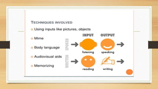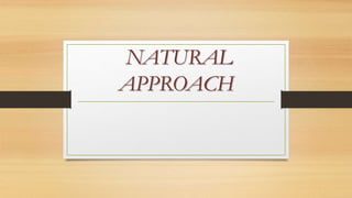 The Natural Approach developed by Stephen Krashen and Tracy Terrell believes that adults can still acquire a second language naturally like children through comprehensible input. It focuses on providing a low-anxiety environment where adults acquire, not learn, the language through activities like role-plays, songs, and games. The teacher acts as a facilitator and students progress at their own pace through the natural order of language acquisition without explicit grammar instruction. While easy to implement, it may take a long time for students to develop more advanced skills under this approach.